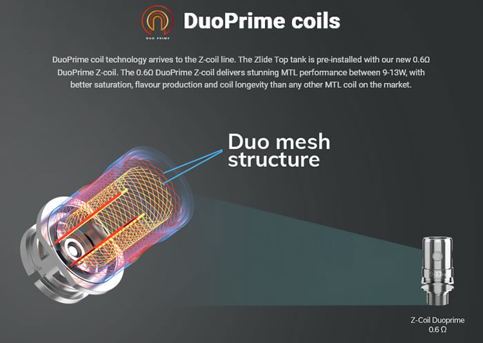 With the introduction of the Z60 comes the DuoPrime coil technology to the Z-coil line. The Zlide Top tank is pre-installed with our new 0.6Ω DuoPrime Z-coil. The 0.6Ω DuoPrime Z-coil delivers stunning MTL performance between 9-13W, with better saturation, flavour production and coil longevity than any other MTL coil on the market.